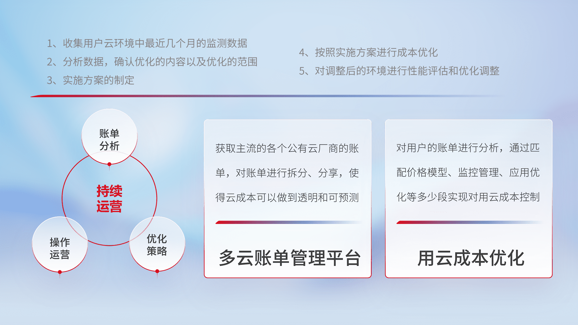 通过多云纳管,,以统一的资源数据模型把客户的云资源进行抽象和封装,,,进而实现对多云资源的统一操作,,保障云资源管理的可靠性、、、、稳定性与可用性。。。量身定制化运维内容,,,配置、、、、开发运维、、、补丁管理、、、备份、、、、监控、、、、认证和访问管理、、审计和日常巡检等,,,,保障在用云过程中的可靠度,,稳定度以及高可用率。。。。
